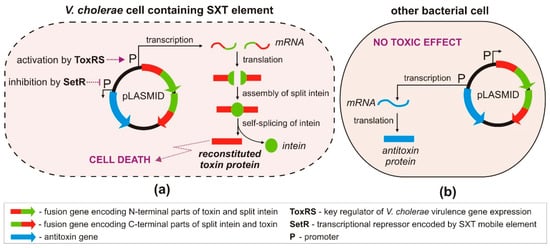 To better control CcdB production in vivo, the gene for this toxin was divided into two parts, and each was fused with DNA encoding split inteins. The generation of a functional toxin occurs in three stages: (i) expression of the two polypeptides, (ii) their association and ligation into a single fusion protein, and (iii) self-splicing of the intein (Figure 4). An important step in this strategy was the construction of a mobilizable plasmid containing genes encoding the antitoxin and the engineered toxin–intein, whose expression could be independently regulated in bacteria harboring specific transcription factors. Although the plasmid could be readily transferred by conjugation from E. coli to other bacteria, the toxic effect was observed exclusively in strains of Vibrio cholerae. This host specificity was achieved by cloning the engineered ccdB toxin–intein genes downstream of a promoter regulated by the transcriptional activator ToxRS, a cholera toxin-associated activator characteristic for V. cholerae [] (Figure 4). Bacterial strains lacking ToxRS were unaffected, including the E. coli donor strain and non-pathogenic Vibrio spp.
