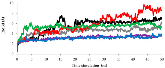 AMS8 lipase root mean square deviations (RMSd) of the backbone atoms as a function of time. The molecular dynamics (MD) simulation was conducted up to 50 ns with Ca2+ ions; black, grey, red, green, purple, and blue indicate the scores of RMSd without Ca1(—), Ca2(—), Ca3(—), Ca4(—), Ca5(—), and Ca6(—), respectively.