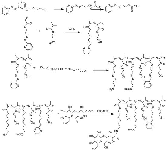 The pyridine concentration in the polymer was quantitatively determined by measuring the UV absorbance at 375 nm after the cleavage by DTT. The concentration of pyridine was calculated based on the extinction coefficient for pyridine-2-thione in DMSO at 375 nm (8080 M−1 cm−1). The molecular weight of polymers was determined by GPC Viscotek GPCmax VE 2001 GPC solvent/sample module equipped with Viscotek VE 3580 RI detector and 270 Dual Detector (Malvern Instruments, Worcestershire, United Kingdom) using THF as mobile phase, and the structure composition was determined by 1H-NMR. The success conjugation of 3-mercaptopropionic acid or cysteamine was confirmed by 1H-NMR (Bruker Avance III HD 300, Billerica, MA, USA) and with a UV-vis spectrometer (Beckman, DU650, Brea, CA, USA). The conjugation efficiency of LBA to PDA-PEG was quantified by a 2,4,6-trinitrobenzene sulfonic acid (TNBSA) assay using cysteamine hydrochloride as standard.