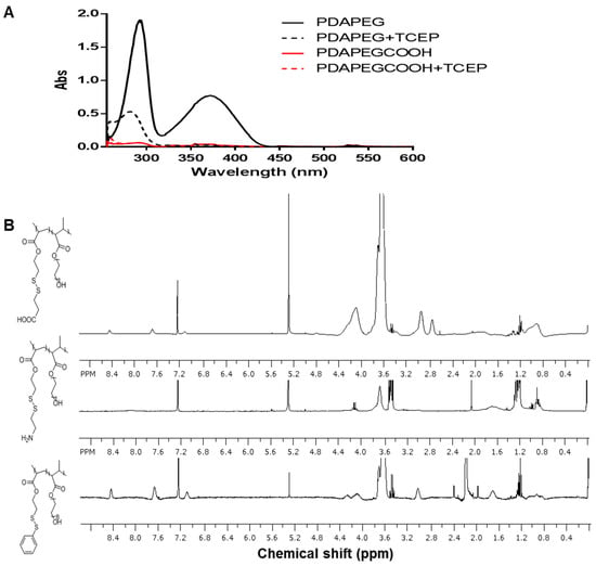 (A). UV–Vis spectrum of polymer PDAPEG or PDAPEG-COOH when co-incubating with 10 mM TCEP. The appeared peak at 375 nm indicates the existence of pyridinethiol in polymer; (B). 1H-NMR of polymer PDAPEG-COOH, PDAPEG-NH2, and PDAPEG in CDCl3.