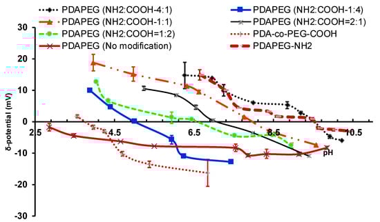 The surface charges of PDAPEG-NH2/PDAPEG-COOH at different amine to carboxylate ratio responsive to environmental pH.