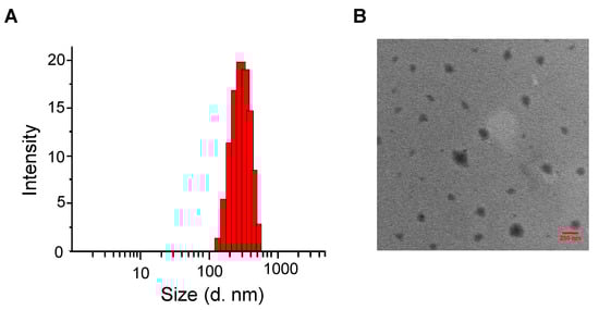 Through electrostatic complexation, a negatively charged PDAPEG derivative formed with complexed positively charged peptide melittin at physiology pH and further condensed it. After the formation of complex, melittin was entrapped within the network of nano-structure and was protected through the outlayer hydration of PEG. The nanocomplex showed a particle hydrodynamic size of 357 ± 30 nm (Figure 5). They were almost spherical according to transmittance electron microscopy. In addition, the surface charge of nanocomplex dropped from −11.8 ± 0.64 to −4.24 ± 0.21 mV also indicates the successful complexation with melittin. This proper size would allow for the passive transportation of nanoparticles entering cancer cells through enhanced permeability and retention effect [].