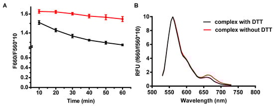 The measured FRET intensities of nanocomplex with or without DTT as a function of time (A) and full spectrum of complex with or without DTT when measured the FRET intensity (B).