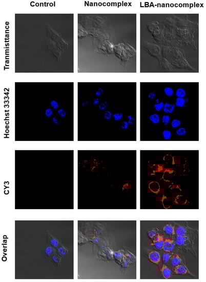 Confocal microscope images of HCT-116 colon cancer cells after incubating with control nanocomplex or LBA-nanocomplex for 3 h.