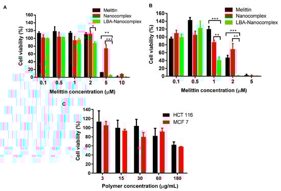 Cytotoxicity of melittin, control nanocomplex, and LBA-nanocomplex for various cancer cells. Cells were incubated with melittin nanocomplex and LBA-nanocomplex at melittin concentration from 0.1 to 10 µM for 24 h. Data represent mean ± SD, (A) HCT 116 cell; (B) MCF-7 cells; (C) Polymer cytotoxicity for HCT-116 and MCT-7 cells. * p < 0.05, ** p < 0.01, *** p < 0.001.
