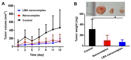 Tumor growth inhibitory effect of the LBA nanocomplex. Tumor growth profile (A) and tumor weight (B) after receiving different treatments. Representative tumor images of each group at the end of treatment (insert). * p < 0.05.