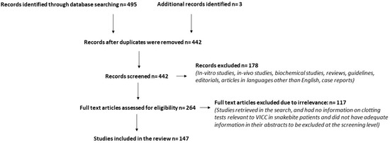 A literature search was carried out in MEDLINE® from 1946 to 30 November 2019 looking for research articles that describe clinical studies of bedside coagulation tests in snakebite patients. The following search terms were used: “whole blood clotting time”, “whole blood coagulation time”, “whole blood clotting time 20”, “bedside clotting time”, “bedside clotting test”, “Lee–White clotting time”, “venous clotting time”, “clotting time”, “snakebite”, “snake envenomation”, “snake envenoming”, “venom-induced consumption coagulopathy”, “VICC”, “coagulopathy” and “bleeding”. Case reports were excluded. This search yielded 495 articles. Reference lists of retrieved articles were searched for additional articles as well. After removing duplicates, a total number of 442 articles was found (Figure 1). We then excluded in vitro studies, in vivo studies, biochemical studies, reviews, guidelines, editorials and articles in languages other than English. This resulted in 264 articles. The full text of each of the 264 articles was reviewed and a further 117 studies were excluded. The review included 147 studies.