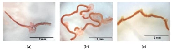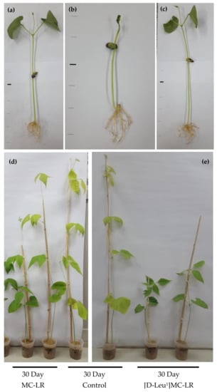 Representative images of developed plants after 10 days ((a) control, (b) 3.5 µg [D-Leu1]MC-LR/mL and (c) 3.5 µg MC-LR/mL) and 30 days (d,e) toxin treatment during the imbibition stage.