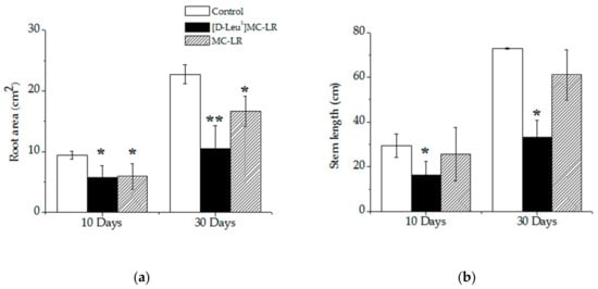 Similarly, and in agreement with the results reported for prolonged exposures [,], we observed alterations in root development as indicated by a decrease in root area 10 days post imbibition. Again, this alteration was more evident in the specimens exposed to [D-Leu1]MC-LR; after 30 days in the absence of contact with the toxin there was no sign of damage recovery, whereas in the case of MC-LR there was a reversal towards control values. Stem length was not significantly affected after a single contact with MC-LR, whereas in the case of [D-Leu1]MC-LR the stems were significantly shorter both 10 and 30 days post treatment. More severe undulation of leaf edges was observed for the [D-Leu1]MC-LR-treated group.