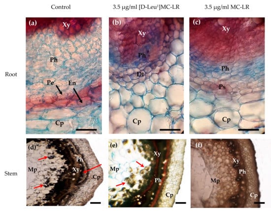 Representative slices of roots (Alcian blue/Safranin stained) and stems (“O” red oil/ IKI stained) from the control (a,d), 3.5 µg [D-Leu1]MC-LR/mL- (b,e,) and 3.5 µg MC-LR/mL- (c,f) treated groups, 10 days after the imbibition stage. Xy: Xylem; Ph: Phloem; Pe: Pericycle; En: Endodermis; Cp: Cortical parenchyma; Dt: Disorganized tissue; Ps: Parenchymal sheath; Mp: Medullary parenchyma. Scale lines: 100 µm.