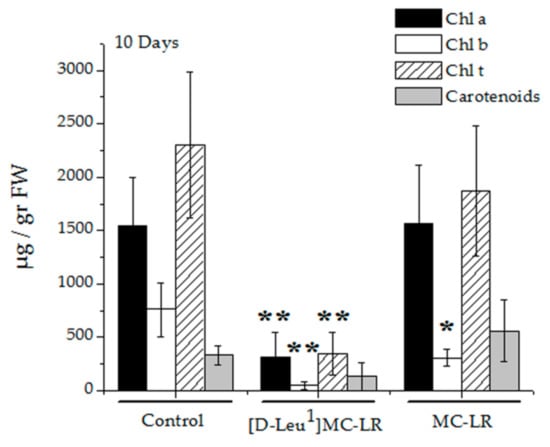 Chlorophyll a (black bar), chlorophyll b (white bar), total chlorophyll (dashed bar) and carotenoids (grey bar) levels in leaves from the control (n = 10), 3.5 µg [D-Leu1]MC-LR/mL- (n = 4) and 3.5 µg MC-LR/mL- (n = 6) treated plants 10 days after the imbibition stage. The results are expressed as the mean ± SD. (*) Indicates significant differences with respect to the control values and (**) indicates significant differences between the MCs congeners at the same concentration, according to the ANOVA test of two independent populations (p < 0.05).