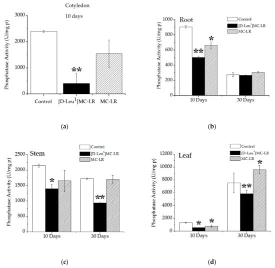 Phosphatase activity in the cotyledon (a) 10 days post treatment, root (b), stem (c) and leaf (d) (10 and 30 days post treatment) in the control (white bar), 3.5 µg/mL [D-Leu1]MC-LR- (black bar) and 3.5 µg/mL MC-LR- (dashed bar) treated seedlings. The results are expressed as the mean ± SD (n = 20). (*) Indicates significant differences with respect to control values and (**) indicates significant differences between the MCs congeners at the same concentration, according to the ANOVA test of two independent populations (p < 0.05).