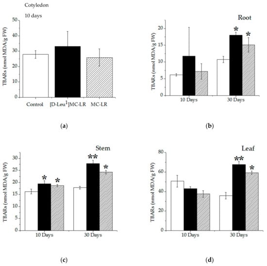 Thiobarbituric acid reactive substances (TBARS), measured as malondialdehyde (MDA), were determined in plant tissues, indicating lipid peroxidation. Ten days after toxin contact, a slight increase in the TBARS levels was observed only in the stems of the [D-Leu1]MC-LR- and MC-LR -treated groups (Figure 9c). In the cotyledon, roots and leaves of the toxin-treated plants, the TBARS levels were no different from the control group (Figure 9a,b,d).