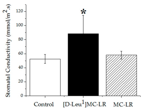 At 10 days post imbibition, an increase in stomatal conductivity was observed in the leaves of the [D-Leu1]MC-LR-exposed plants compared to the control group. The stomatal conductivity values of the MC-LR-treated plants showed no differences with respect to the control group (Figure 10). This result correlates with the increase in stomatal density observed 10 days post treatment with [D-Leu1]MC-LR.
