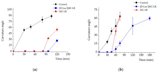 Our results indicate a delay in the phototropic response of seedlings treated with 3.5 µg [D-Leu1]MC-LR/mL and 3.5 µg MC-LR/mL, 10 days after imbibition, compared to the control group. After 30 min of exposure to a point light source, the control seedlings showed a curvature angle of 54 ± 3° whereas seedlings treated with [D-Leu1]MC-LR or MC-LR showed no response (Figure 11a). The [DLeu1]MC-LR-treated seedlings showed the longest delay in phototropic response, reaching a curvature angle of 27 ± 3° after 120 min. In the case of MC-LR-treated plants the curvature angle was 33 ± 2° at 96 min. The lowest maximum curvature angle reached during the study of phototropic effects was in treated plants. Thus, while the control presented an angle of 89 ± 6° at 105 min, the seedlings treated with MC-LR showed an angle of 55 ± 4° at 120 min. The lowest curvature angle recorded during the study was that observed in seedlings treated with [D-Leu1]MC-LR, which presented a curvature angle of 27 ± 3° at 120 min.
