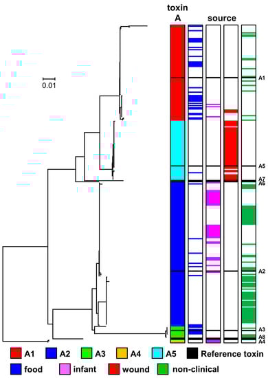 - Mazuet, C.; Legeay, C.; Sautereau, J.; Ma, L.; Bouchier, C.; Bouvet, P.; Popoff, M.R. Diversity of Group I and II Clostridium botulinum Strains from France Including Recently Identified Subtypes. Genome Biol. Evol. 2016, 8, 1643–1660. [Google Scholar] [CrossRef]