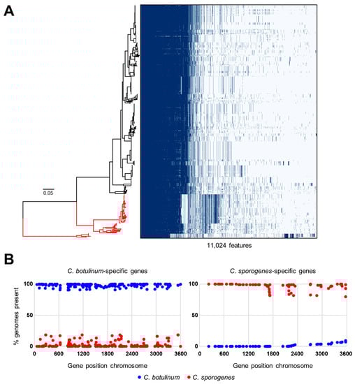 Pangenome analysis was used to search for genes for C. botulinum Group I and C. sporogenes. The pangenome of the combined 556 genomes was generated using Prokka-annotated genome sequences and the Roary software package [99], followed by identification of lineage-specific genes defined. The pangenome consisted of 18,731 annotated features, with 2420 annotated features present in >95% of the genomes (core genome). The distribution of genes linked to the position in the core genome-based phylogenetic tree is shown in Figure 6A. Due to the different sizes of the groups, lineage specificity was initially set at present in ≥90% (over-represented) or present in ≤10% (under-represented) for C. botulinum Group I, and ≥80%/≤20% for the larger 94-genome C. sporogenes cluster, and ≥70%/≤30% for the smaller 10-genome C. sporogenes cluster. This identified 224 features over-represented in C. botulinum, and 79 features over-represented in C. sporogenes. The relative position of features specific for C. botulinum Group I and C. sporogenes were plotted using the complete genomes of C. botulinum Group I strain ATCC 19397 and C. sporogenes strain NCIMB 10696 (Figure 6B), and these features were spread throughout the chromosome, similar to the two C. botulinum Group II lineages [2].
