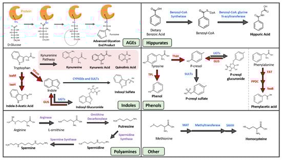 Gut-Derived Protein-Bound Uremic Toxins. Blue text: human enzymes, red text: microbial enzymes, purple text: both human and microbial enzymes. AGE, advanced glycation end product; CYP450, cytochrome P450; FAT, phenylalanine dehydrogenase or transaminase; feaB, phenylacetaldehyde dehydrogenase; GUS, beta-glucuronidase; IaaH, indole-3-acetamide hydrolase; IaaM, tryptophan 2-monooxygenase; MAT, methionine adenosyltransferase; PPDC, phenylpyruvate decarboxylase; SAHH, s-adenosylhomocysteine hydrolase; SULT, sulfotransferase; ThiH, tyrosine lyase; TPase, tryptophanase; TPL, tyrosine phenol-lyase; UGT, UDP-glucuronosyltransferase.