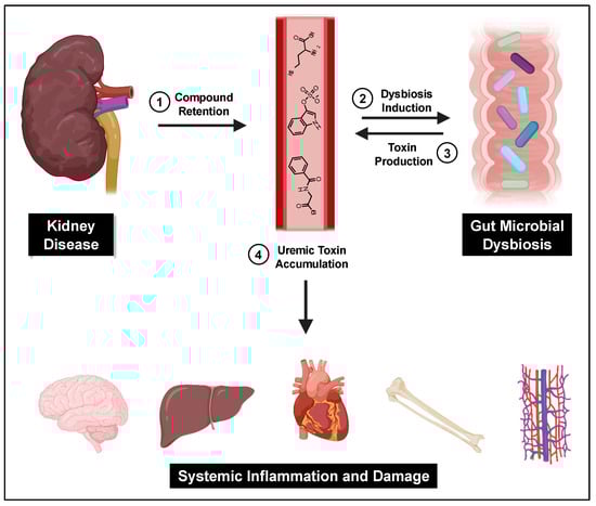 Patients with kidney disease experience intestinal wall edema and congestion, slower transit times, metabolic acidosis, and decreased processing of dietary fibers. Each of these factors alters gut epithelial tight-junctions, affects the translocation of microbial metabolites, and increases intestinal permeability []. Together, they impair immune system function and lead to systemic inflammation, which furthers gut dysbiosis and advances kidney damage.