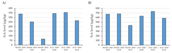 Impact of the water content in extraction mixtures on tenuazonic acid (TeA) levels in incurred samples ((A) breakfast cereal; (B) rice flour). All extraction mixtures were supplemented with 0.1% formic acid.