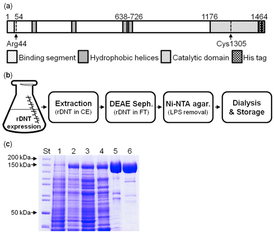 High level production of soluble recombinant DNT protein was then achieved by expression of the dnt gene at 20 °C for 24 h in Escherichia coli Rosetta 2 cells that harbor tRNAs genes for rare codons and efficiently translate the mRNA transcripts of G:C-rich genes. The C-terminally tagged DNT protein was purified from the cytosolic fraction of bacterial lysates by a combination of pre-purification on DEAE Sepharose at pH 7.4 followed by ion metal affinity chromatography on Ni-NTA agarose (Figure 1b), where the contaminating E. coli outer membrane lipopolysaccharide (LPS) and other components were removed by extensive washing of the column with 1% (v/v) Triton X-100 [31]. The yield after the two purification steps was 3 mg of LPS-free (<100 EU/mg) DNT per 1 L of bacterial culture (Figure 1c). The same procedure was used to purify the catalytically inactive DNT-C1305S toxoid [22] used throughout this work as negative control.