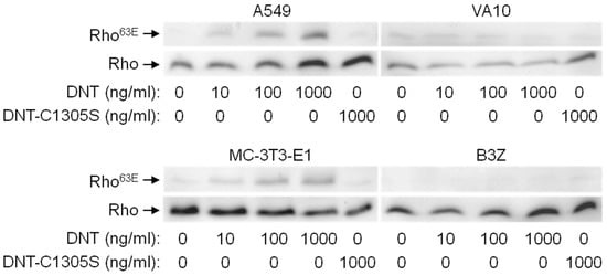 We next analyzed whether the purified rDNT toxin was able to penetrate cells and specifically deamidate Gln63 of RhoA to produce RhoA63E that is detectable by a specific antibody. As shown in Figure 4, the rDNT protein was highly active, since deamidated RhoA63E was detectable in human A549 and mouse MC-3T3-E1 cells exposed to as little as 10 ng/mL of rDNT for 4 h and the RhoA63E amounts increased with increasing concentrations of rDNT. In contrast, no RhoA63E formation was detected upon treatment with the enzymatically inactive rDNT-C1305S toxoid, serving as a negative control. The cell penetration activity of rDNT depended on the interaction with cellular receptor, as no formation of RhoA63E was observed in VA10 and B3Z cells even upon exposure to 1000 ng/mL of rDNT.