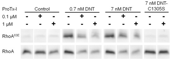 ProTx-I blocks the entry of DNT into cells. MC-3T3-E1 cells were pretreated with different concentrations of ProTx-I (0, 0.1, and 1 µM) for 1 h. Then the cells were incubated with DNT or DNT-C1305S for next 4 h, lysed, and the deamidation of RhoA was determined on Western blots as described in the legend to Figure 4. The used 0.7 nM DNT corresponded to 100 ng DNT/mL.