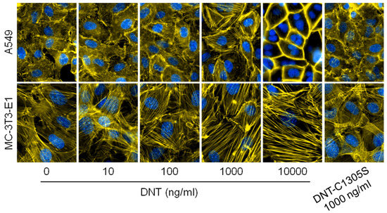 A549 and MC-3T3-E1 cells were seeded on coverslips (Ø 12 mm) at a density of 2 × 104 cells per cm2. After 24 h incubation at 37 °C and 5% CO2 in complete medium (DMEM with 10% FCS), the cells were treated 12 h with various concentrations of DNT or DNT-C1305S in complete medium. Then the cells were washed with PBS, fixed in 4% PFA for 20 min, permeabilized by 0.2% Triton X-100 for 10 min and blocked by 1 h incubation in 5% BSA. For staining, the cells were incubated for 45 min with 20 µg/mL of phalloidin/TRITC (Sigma–Aldrich, St. Louis, MO, USA) and 4 µg/mL of DAPI (Sigma–Aldrich, St. Louis, MO, USA), both diluted in PBS buffer supplemented with 2% BSA and 0.02% Triton X-100. After rinsing with the same buffer, the coverslips were mounted in Vectashield mounting medium (Vector Laboratories, Burlingame, CA, USA) and observed on an Olympus CellR system (IX81 microscope at 60× magnification).