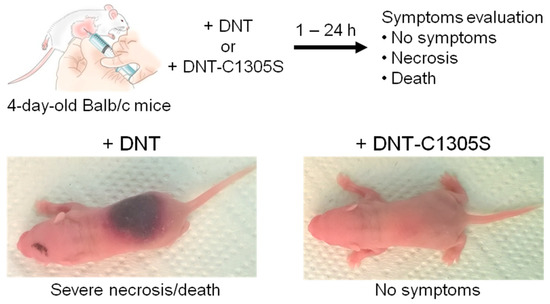 Four-day-old suckling female mice Balb/c, obtained from a breeding colony at the Institute of Molecular Genetics of the Czech Academy of Sciences in Prague, Czech Republic, were inoculated subcutaneously in the nuchal area with 1 µg of endotoxin-free recombinant DNT or its DNT-C1305S variant and the symptoms like necrosis or dead were observed few hours after the injection. This assay is a standard control used in the whole cell pertussis vaccine testing procedure (WHO Manual for Quality Control of Diphtheria, Tetanus and Pertussis Vaccines, 2013).