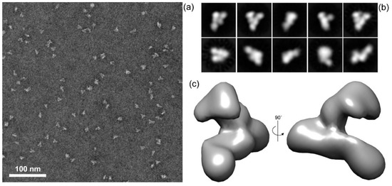 To obtain some insight into DNT structure, we used negative staining transmission electron microscopy (TEM) with single particle image analysis. A homogenous preparation of the LPS-free rDNT was obtained by size exclusion chromatography on a Superdex 200 column form which rDNT eluted as a single peak with retention time corresponding to about 150 kDa, indicating that rDNT was monomeric. The protein was deposited on glow-discharged carbon-coated copper grids, negatively stained with uranyl acetate and visualized by TEM. The micrographs revealed that the preparation consisted of highly homogenous rDNT particles, and very few aggregates or degradation products were present (Figure 8a). A total of 22,404 particles were extracted from 29 micrographs and subjected to the reference-free two-dimensional (2D) classification to remove the noisy particles. The 2D classification resulted in 12 well-defined classes of 8365 particles that were selected for further processing.
