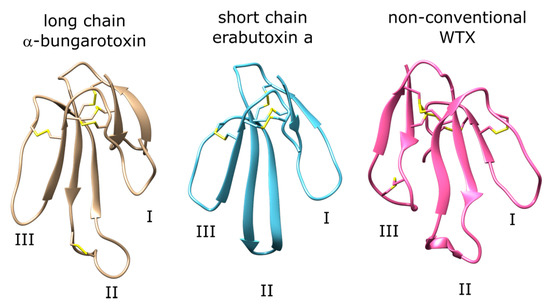 Examples of long-chain, short-chain, and non-conventional three-finger toxins (3FTX) with the three loop regions labeled. The disulfide bonds are shown explicitly with sulfur atoms shown with yellow.