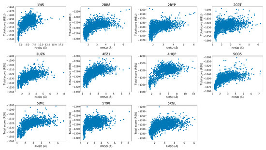 The score versus root mean square deviation (RMSD) plots of the re-docking calculations using the native crystal structures as the reference.