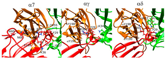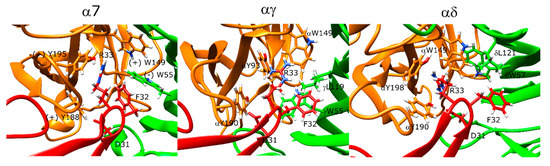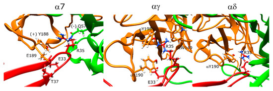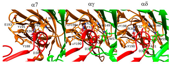 At the αγ and αδ interfaces, R30 interacted with αY190 and αY198. F29 formed hydrophobic interactions with δW57 and δL121, but the distance between these residues and F29 was longer at the αγ interface (Figure 7, middle and right panels). S32 formed a hydrogen bond with the peptide residue Q33 and γK34, correspondingly, at αδ and αγ interfaces. The interactions between the peptide residues N68 and the protein observed for α7 were also observed for these two interfaces.