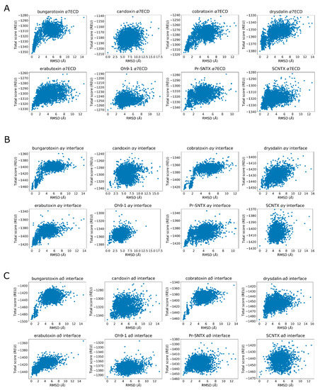 Score versus RMSD plots calculated for the eight peptides at the (A) α7 interface, (B) αγ interface, (C) αδ interface.