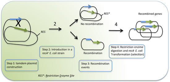 The technique known as in vivo intramolecular recombination [75] is based on the construction of a “tandem plasmid” where two truncated proteins, in direct repeated orientations, are cloned (Figure 1). The truncated genes (one lacking the 3′ end of the gene and the other the 5′ end) only overlap in an area where the recombination is intended. Tandem plasmid contains an enzyme restriction site to further discriminate between recombinant plasmids (where the restriction site is lost) and the parental one. Once the tandem plasmid is introduced in a recombinase positive E. coli strain (Rec+), random recombination takes place at the homologue regions and novel hybrids or chimeras are produced.