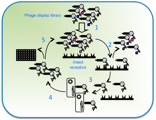 As has been reviewed thus far, generation of 3D-Cry toxin variants does not represent a big challenge nowadays as many molecular techniques for constructing libraries with a high number of mutants are available. The real challenge is to find which of the variants in the library is useful and has the desired properties. Therefore, the key question of in vitro evolution of a protein is the library screening. In the particular case of 3D-Cry toxins, this screening is labor-intensive as every single mutant has to be expressed, solubilized, and bioassayed, representing a time consuming task. As a consequence, only a reduced number of variants from the library are normally tested, and on many occasions, no improved mutants are found. To overcome this problem, approaches such as phage display have been explored to provide a means for the selection of potentially useful 3D-Cry mutants. Phage display is a molecular tool for the screening of library variants with a specific binding characteristic. A phage displayed protein (or a mutant library) consists of its expression on the surface of a bacteriophage in such a way that the protein is available to interact with other proteins, while it is bound to the virus. Display is achieved thanks to the fusion of the protein of interest (or library) to one of the proteins on the surface of the phage. When the phage replicates and viral particles assemble, the protein of interest is also assembled on the surface, being available to interact with other proteins. Displayed libraries can be screened by a process called biopanning, a methodology that allows for the selection of those phages with the desired binding properties (Figure 3). As the phenotype of the selected variant and the genotype in a phage display system are linked, once a phage is selected, the coding DNA for the protein variant can be obtained from the phage genome. Given that one of the premises for 3D-Cry toxin toxicity is to bind to a receptor, this makes phage display a suitable molecular tool for the screening of variants with novel binding characteristics.