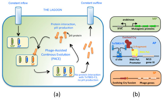 Phage assisted continuous evolution (PACE). In the PACE technique, the evolution occurs in a continuous culture of a highly engineered E. coli strain called the lagoon (a). The E. coli strain contains three plasmids (b), the mutagenic plasmid (MP), containing mutagenic proteins induced by arabinose, the selection plasmid (SP), which contains all the M13 genes for phage replication, except for gene III, and a transcriptional fusion of the evolving cry gene toxin and the rpoZ gene, codifying for the omega sub-unit of the RNA polymerase, and the accessory plasmid (AP). AP plasmid contains the M13 gene III downstream of a cI site and a promoter. The fusion protein between cI and a fragment from T. ni cadherin like receptor (TnTBR3-F3) binds to the cI site. Only Cry toxin variants interacting with TnTBR3-F3 will bind to the proximity of the promoter site so the gen III expression will be possible, rendering viable infecting M13 particles. However, if Cry toxins with no affinity toward the TnTBR3-F3 fragment are produced, gene III will not be expressed and no infecting M13 particles will be generated. Reproduced from [146] Copyright 2016, Springer Nature.
