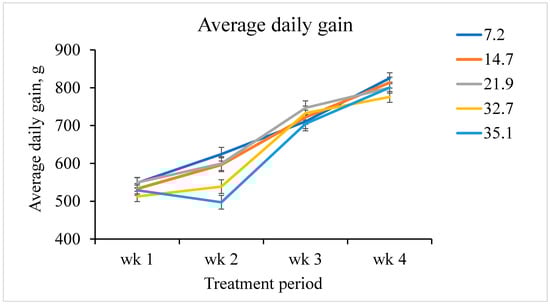 Weekly average daily gain of pigs fed increasing fumonisin concentration. The dietary fumonisin levels were 7.2, 14.7, 21.9, 32.7, and 35.1 mg/kg of fumonisin (B1 + B2). There was a linear fumonisin concentration × week interactive effect (p < 0.001). From day 0 to 7, there was no evidence of a linear effect (p = 0.182) and a quadratic effect (p = 0.785). From day 7 to 14, there was a linear effect (p < 0.001) and a tendency of a quadratic effect (p = 0.084). From day 14 to 21, there was no evidence of linear effect (p = 0.888), but a tendency to a quadratic effect (p = 0.077). From day 21 to 28, there was a tendency to a linear effect (p = 0.053) and no evidence of a quadratic effect (p = 0.615).
