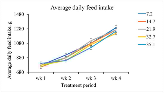 Weekly average daily feed intake of pigs fed increasing fumonisin concentration. The dietary fumonisin levels were 7.2, 14.7, 21.9, 32.7, and 35.1 mg/kg of fumonisin (B1 + B2). There was a linear fumonisin concentration × week interactive effect (p = 0.008). From day 0 to 7, there was no evidence of a linear effect (p = 0.328) or a quadratic effect (p = 0.427). From day 7 to 14, there was a linear effect (p = 0.007), but no evidence of a quadratic effect (p = 0.892). From day 14 to 21, there was a tendency to a linear effect (p = 0.077) and a quadratic effect (p = 0.041). From day 21 to 28, there was a linear effect (p = 0.030), but no evidence of a quadratic effect (p = 0.698).