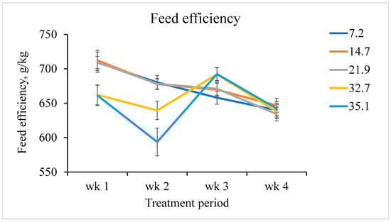 Weekly feed efficiency of pigs fed increasing fumonisin concentration. The dietary fumonisin levels were 7.2, 14.7, 21.9, 32.7, and 35.1 mg/kg of fumonisin (B1 + B2). There was a linear fumonisin concentration × week interactive effect (p < 0.001). From day 0 to 7, there was a linear effect (p < 0.001) and a tendency to a quadratic effect (p = 0.051). From day 7 to 14, there was a linear effect (p < 0.001) and a quadratic effect (p = 0.004). From day 14 to 21, there was a linear effect (p = 0.010), and no evidence of a quadratic effect (p = 0.826). From day 21 to 28, there was no linear effect (p = 0.877) and no quadratic effect (p = 0.864).