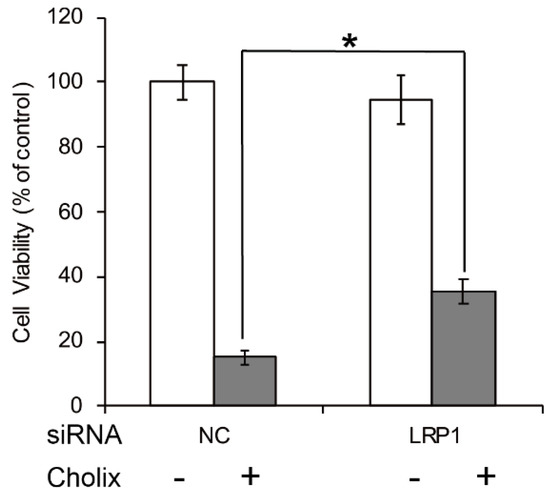 Effects of LRP1 knockdown in Cholix-treated HeLa cells. HeLa cells were treated with non-targeting control (NC) or LRP1 siRNA for 48 h and incubated with PBS (−) or Cholix (+) for 24 h. Cell viability was measured with a Cell Counting Kit (Dojindo). Asterisks indicate p < 0.05 with the Student’s t-test.