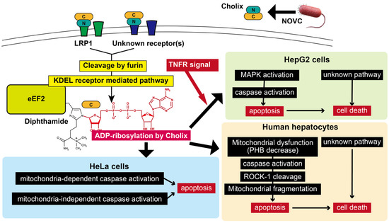 Proposed model of Cholix-induced cell death pathways. The cell death signal pathways in HepG2 cells [70], hepatocytes [46,70], and HeLa cells [47] are shown. This figure is described in the “Conclusion”. Marvin ChemAxon was used for drawing ADP-ribosylated diphthamide (https://www.chemaxon.com).