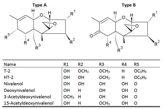 - Lattanzio, V.M.T.; Pascale, M.; Visconti, A. Current analytical methods for trichothecene mycotoxins in cereals. TrAC Trends Anal. Chem. 2009, 28, 758–768. [Google Scholar] [CrossRef]