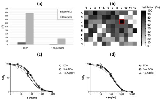 (a) Immunoreactivity of the phage pools isolated after selection rounds 2 and 3. The y-axis depicts the ratio of the TRF europium signal to streptavidin background (S/B) with and without the presence of free DON (500 ng). (b) Screening of individual anti-Id-Abs with a competitive immunoassay on a 96-well plate. The inhibition (%) with free DON was used to select the antibody cDON_1 (C09, highlighted). (c) Inhibition curves of competitive ELISA using 10B5 Mab as a capture and the scFv-BALP (cDON_1) as a tracer. Variable concentrations of DON, 3-AcDON and 15-AcDON. (d) Inhibition curve of a competitive TRF-IA, where cDON_1 was used as a capture and 10B5 Mab as a tracer with variable concentrations of DON, 3-AcDON and 15-AcDON.