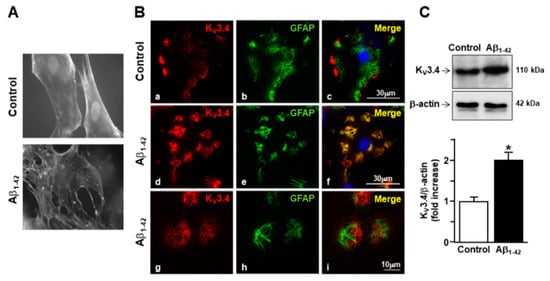 Effect of Aβ1–42 oligomers on the upregulation of KV3.4 protein expression in rat primary astrocytes. (A) Phalloidin-stained images of rat primary astrocytes under control conditions and 48 h after 5 µM Aβ1–42 exposure. Nuclei were marked by Hoechst 33258. (B) Confocal double immunofluorescence images of rat primary astrocytes displaying both KV3.4 (red) and glial fibrillary acid protein (GFAP) (green) immunoreactivities under control conditions (a–c) or 48 h after 5 µM Aβ1–42 exposure (d–i). Higher magnification of the frame depicted in g–i displaying intense immuno-positive fiber bundles double-labeled for both KV3.4 and GFAP in AD astrocytes. Scale bars: a–f: 30 µm; g–i: 10 µm. (C) Western blotting and densitometric analysis of KV3.4 protein levels under control conditions or 48 h after 5 µM Aβ1–42 exposure. Data were normalized on the basis of β-actin and expressed as fold increase compared to control’s expression of three different preparations. * p < 0.05 vs. control.
