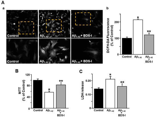 Effects of BDS-I on ROS production, mitochondrial activity, and lactate dehydrogenase (LDH) release in rat primary astrocytes exposed to Aβ1–42 oligomers. (A) Representative images (a) and quantification (b) of the fluorescence intensity of 2′,7′-dichlorodihydrofluorescein diacetate (DCFH-DA) under control conditions or 48 h after 5 µM Aβ1–42 exposure in the absence and in the presence of 50 nM BDS-I. The values are expressed as percentage mean±SEM of three independent experimental sessions. * p < 0.05 vs. controls; ** p < 0.05 vs. Aβ1–42. (B) Quantification of mitochondrial dehydrogenase activity under control conditions or 48 h after 5 µM Aβ1–42 exposure in the absence and in the presence of 50 nM BDS-I. The values are expressed as percentage mean ± SEM of three independent experimental sessions. * p < 0.05 vs. controls; ** p < 0.05 vs. Aβ1–42. (C) Quantification of LDH release under control conditions or 48 h after 5 µM Aβ1–42 exposure in the absence and in the presence of 50 nM BDS-I. The values are expressed as mean ± SEM of three independent experimental sessions. * p < 0.05 vs. control; ** p < 0.05 vs. Aβ1–42.