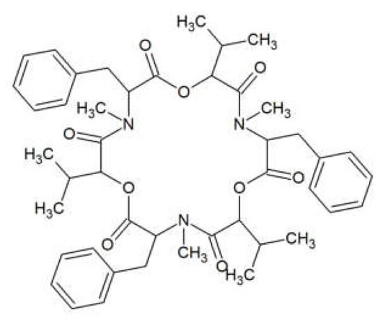 BEA possesses insecticidal and phytotoxic properties and is involved in the etiology of insect and plant diseases caused by the producer fungal strains [16]. The antimicrobial and antibiotic activities of BEA have been tested on human or mammalian intestinal bacteria (see Table 1). BEA also showed endocrine disrupting antagonistic effects at the androgen receptor [17]. It also acts on cellular level as an enzyme inhibitor [18], and as a compound inducing oxidative stress. BEA eases apoptosis, interferes with smooth muscle contraction, impedes with steatosis caused by the storage of cholesterol in liver cells, and according to various bioassays, it is believed to be toxic. Nevertheless, it was discovered that cytotoxicity of BEA depends on the dose, length, and also way of exposure [19,20], because it is able to penetrate to the body through the skin, although its permeation is relatively low [21].