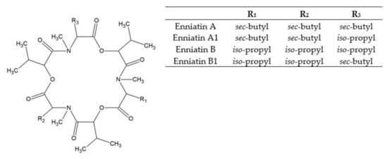 - Sy-Cordero, A.A.; Pearce, C.J.; Oberlies, N.H. Revisiting the enniatins: A review of their isolation, biosynthesis, structure determination and biological activities. J. Antibiot. 2012, 65, 541–549. [Google Scholar] [CrossRef]