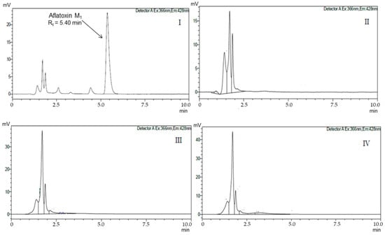 Chromatograms of aflatoxin M1 (AFM1) quantification in positive and negative control. (I) Positive control: phosphate buffer solution (PBS) with AFM1. Rt = Retention time of AFM1 in phosphate buffer solution; chromatographic peak area corresponding to AFM1; (II) Negative control after 1 h of incubation: PBS + L. paracasei 108; (III) Negative control after 1 h of incubation: PBS + L. plantarum 49; (IV) Negative control after 1 h of incubation: PBS + L. fermentum 111.