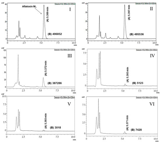 Chromatograms of aflatoxin M1 (AFM1) quantification in PBS. (I) Chromatogram of assays after 1 h of incubation: PBS + AFM1 + L. paracasei 108; (II) Chromatogram of assays after 1 h of incubation: PBS + AFM1 + L. plantarum 49; (III) Chromatogram of assays after 1 h of incubation: PBS + AFM1 + L. fermentum 111; (IV) AFM1 recovery chromatogram of L. paracasei 108 and AFM1 complex after 1 h of incubation; (V) AFM1 recovery chromatogram of L. plantarum 49 and AFM1 complex after 1 h of incubation; (VI) AFM1 recovery chromatogram of L. fermentum 111 and AFM1 complex after 1 h of incubation. (A) Retention time (min) of aflatoxin M1 in phosphate buffer solution; (B) chromatographic peak area corresponding to aflatoxin M1.